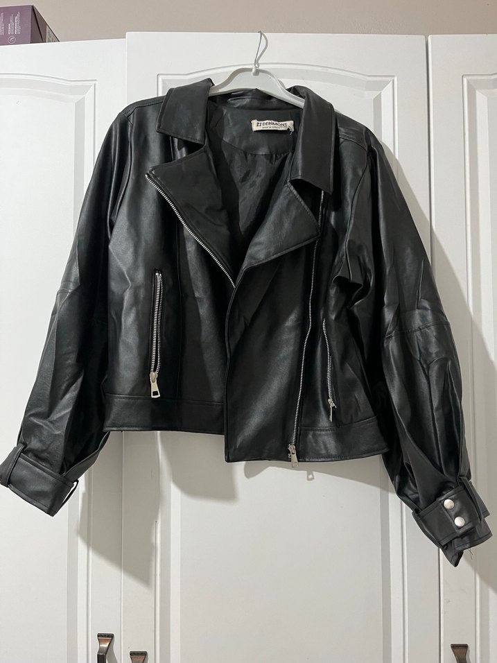 Siyah deri biker ceket, yaka detaylı uzun kollu, bol kesim, oversize günlük kullanıma uygun.