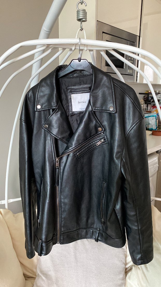 siyah deri biker ceket, kesik yakalı ve normal boyda. Strappy kollu, rahat kesimiyle trend gündelik tarz için ideal.
