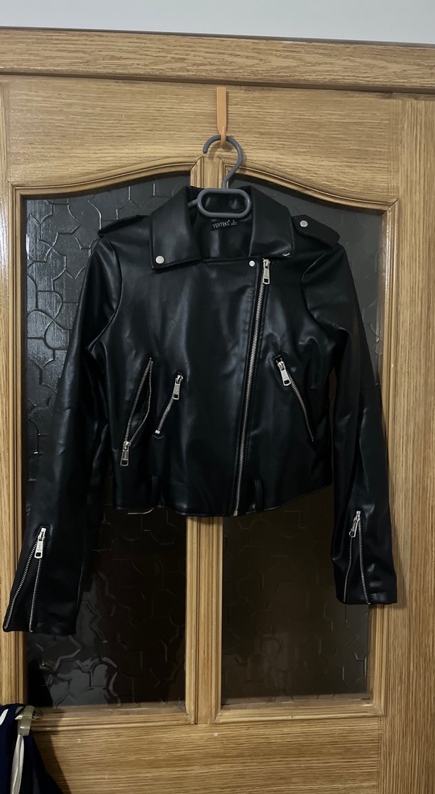 Siyah deri ceket. Kemer yeri var ama kemeri yok orijinali böyle miydi emin değilim. Super crop değil