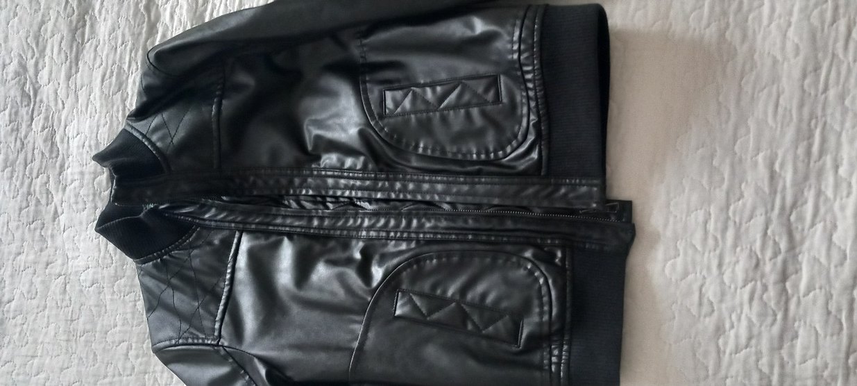 Bu siyah deri biker ceket, çıtçıtlı yakası ve fermuarlı ön kısmıyla dikkat çeker. oğlum 9 yaşında ona tam oluyo yepyeni ve çok tarz