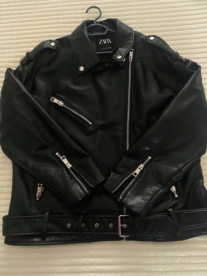 Siyah deri, fermuarlı cepli ve kemerli, fitted kesim biker ceket. Notch yaka ve strappy kollara sahip, grunge punk tarzını yansıtıyor.