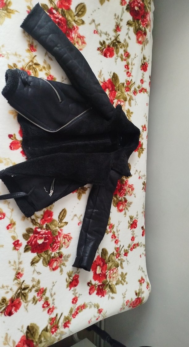 Siyah deri biker ceket, fitted kesim, fermuarlı detaylar ve kesik yaka ile tasarlanmıştır. Askılı kollu ve normal boydadır, floral desenle şık bir görünüm sunar.