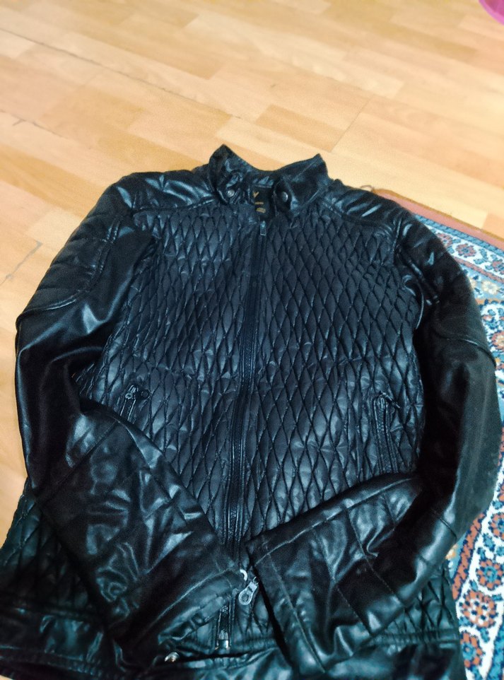 Fermuarlı cepleri ve balık sırtı desenli ön yüzü olan siyah deri biker ceket, uzun kollu ve boğazlı yaka ile şık bir görünüm sunar.