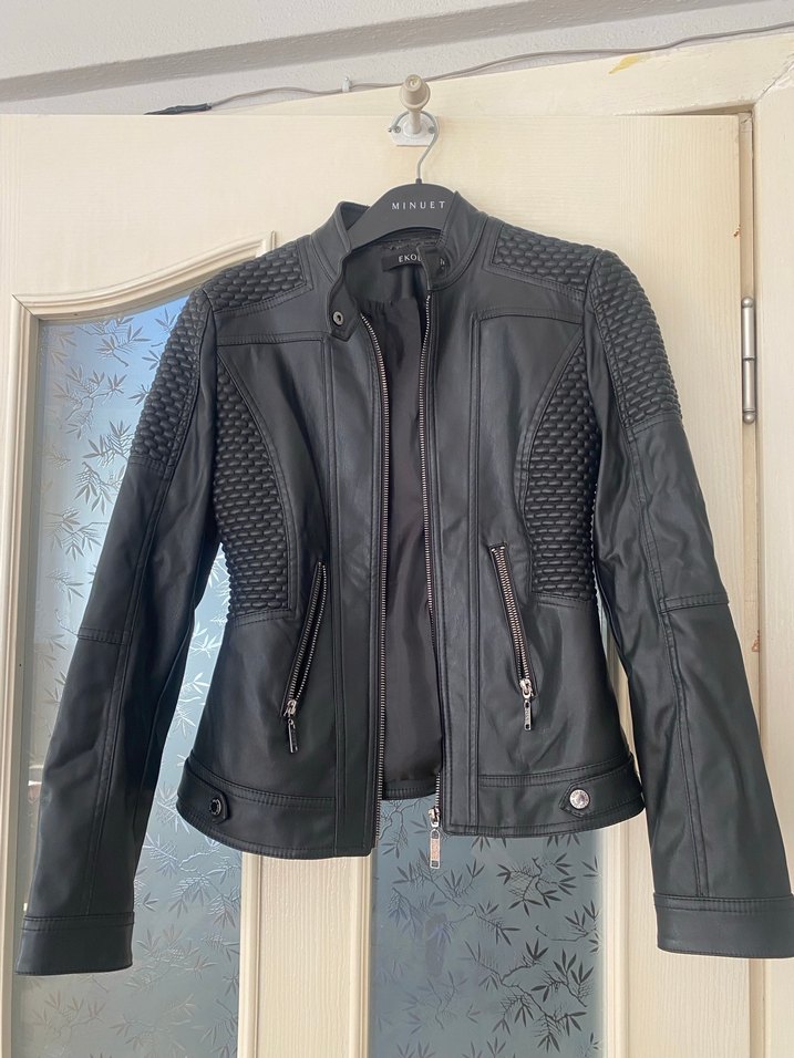 Bu siyah deri biker ceket, oturmuş kesimi, çıtçıtlı yakası ve fermuarlı cepleriyle dikkat çeker. Uzun kollu ve normal midi boydadır.
