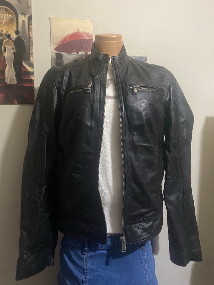 Hakiki Siyah deri biker ceket, bisiklet yaka ve fermuarlı ceplere sahiptir. Normal uzunlukta, uzun kollu ve günlük kullanıma uygun regular fit bir modeldir.