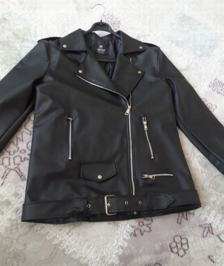 Siyah deri biker oversize kadın ceket, kemerli ve kesik yaka detaylı. büyük geldiği için hiç giymedim alındığı günkü gibi duruyor