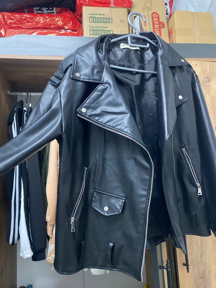 Siyah deri biker ceket, çıtçıtlı yaka ve fermuarlı detaylara sahiptir. Normal boy ve regular fit, günlük sokak stili için uygundur.