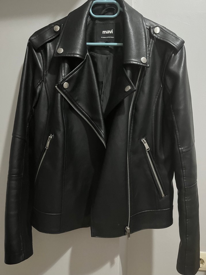 Siyah deri biker ceket, notched yaka ve tokalı detaylara sahiptir. Askılı kollu, normal kesimdir ve günlük kullanım için uygundur. Omuz kısmında soyulmalar mevcut.