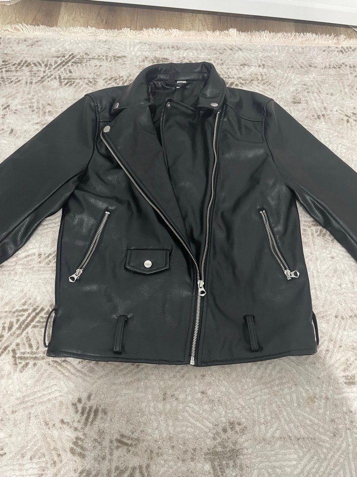 siyah fitted deri biker ceket. Notch yaka ve fermuarlı kolları var. Normal midi boyda, fermuarlı cep detaylı.kemersizdir