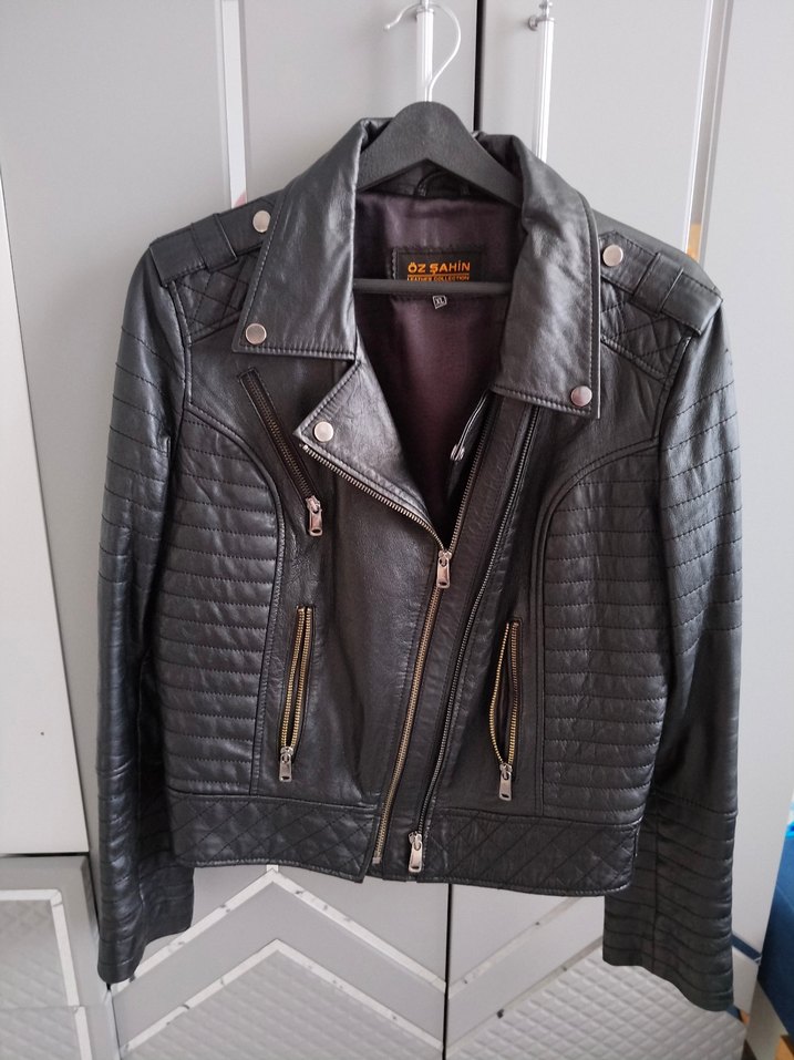 Fermuarlı cepleri, çentikli yaka ve askılı kollarıyla siyah, oturmalı deri biker ceket. Midi boyda, desen içermeyen, Paris punk havası taşıyor. Orjinal Deridir. Hiçbir deformesi yoktur