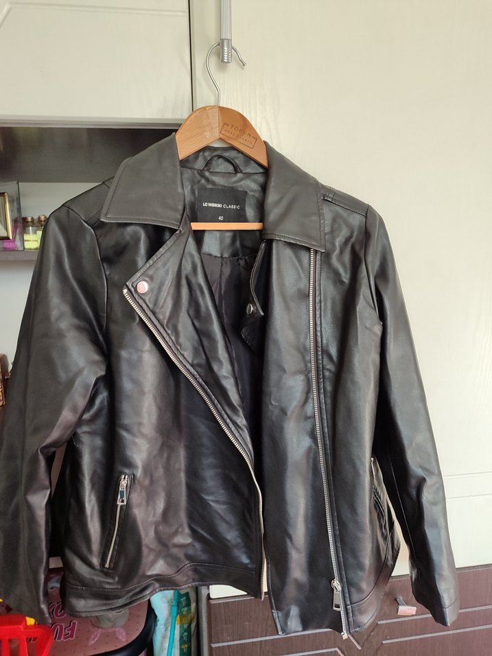 Siyah deri biker ceket, kesik yaka ve fermuarlı detaylara sahiptir. Regular fit ve askılı kollarıyla günlük sokak stiline uygundur.