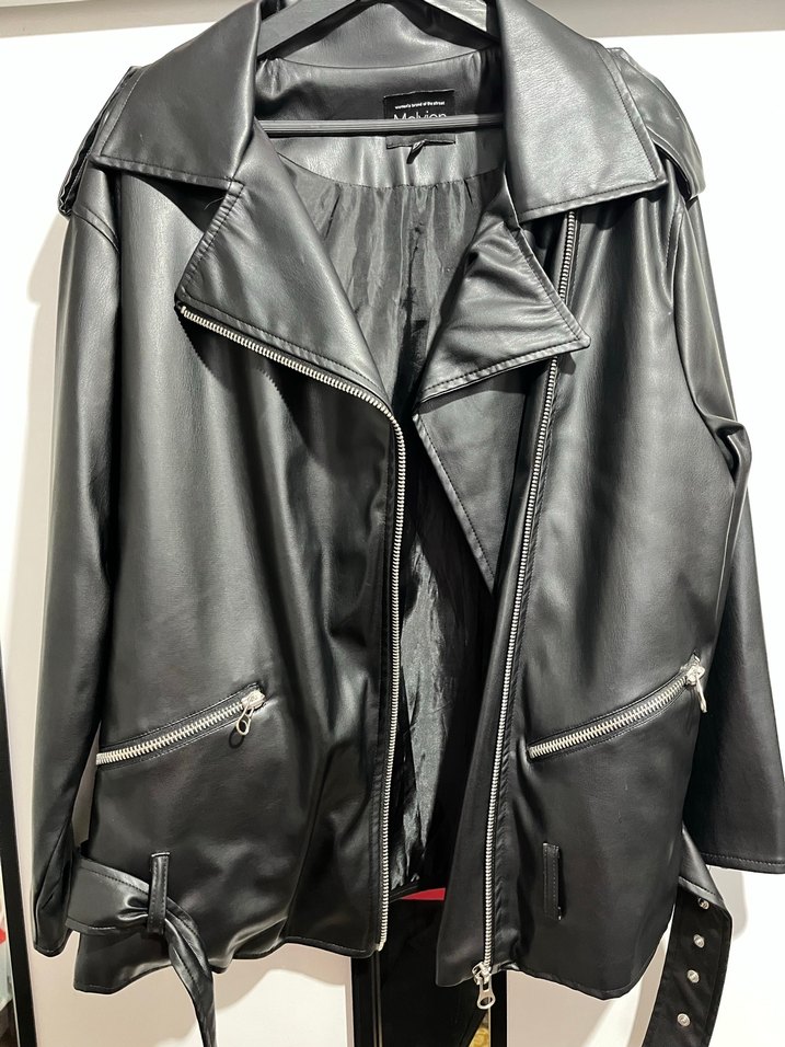 Siyah deri biker ceket, yakalı ve kemerli, askılı kollu tasarıma sahip. Normal midi boyda ve regular kesim, günlük kullanıma uygun.