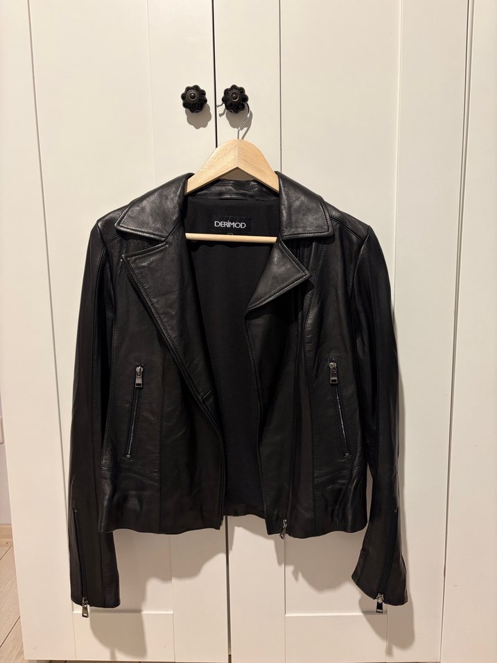 Derimod M beden %100 deri ceket. Hiç giyilmedi. Sadece son fotoğrafa koyduğum gibi fermuarında çizik var. Ben S bedenim ama M beden de rahatlıkla oluyor.