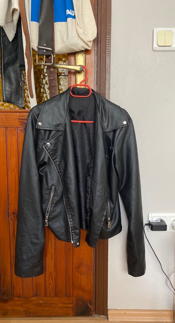 Fermuarlı detaylara sahip, siyah deri biker ceket. Oturmalı kesim, uzun kollu ve normal boyda, grunge punk tarzını yansıtır. M ve S bedene uygundur.