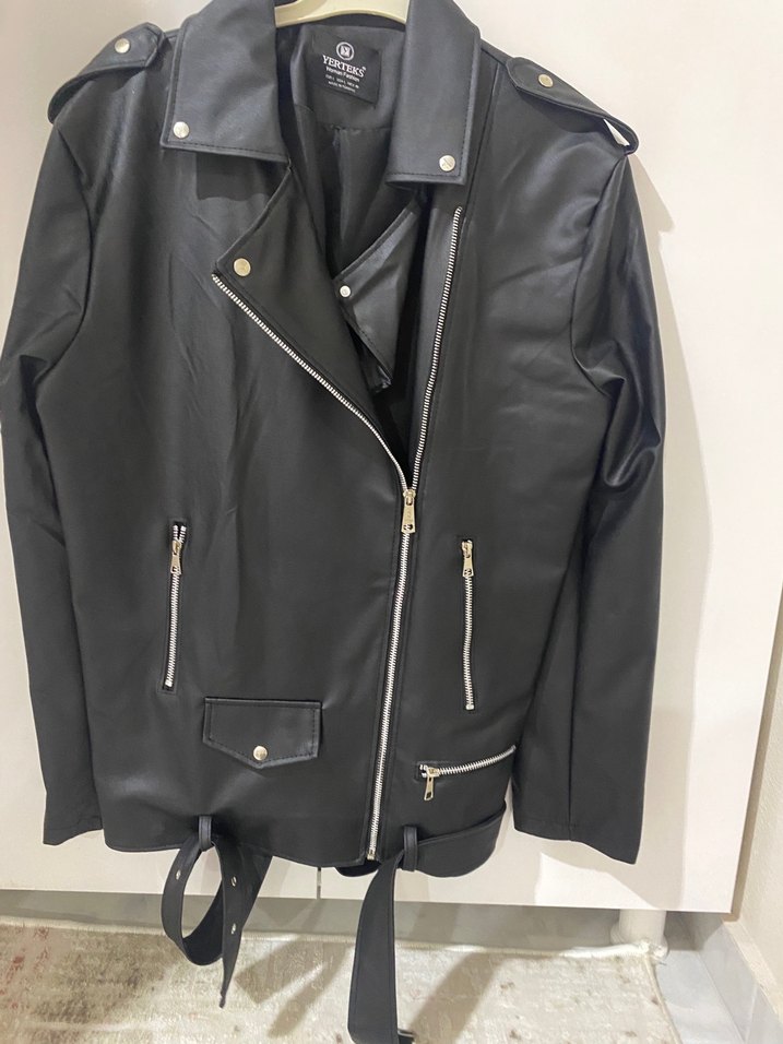 Siyah deri biker ceket, kırmalı yaka ve kemerli bel detayına sahip. Askılı kollu, normal kesim ve günlük kullanıma uygun.