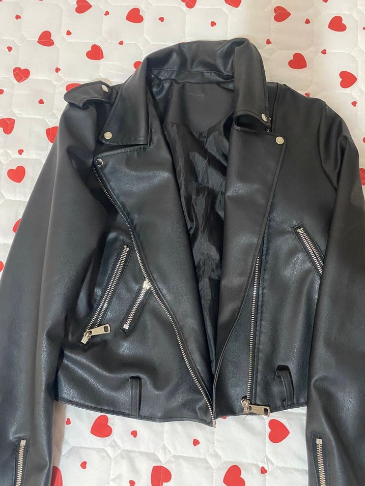 Siyah deri, fitted biker ceket, kesik yaka ve fermuarlı ceplerle. Askılı kolları ve rock punk havasıyla günlük kullanıma uygun. hiçbir sorunu yok iki kere giydim