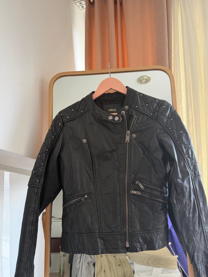 Gerçek deridir. Bu siyah deri biker ceket, tokalı detaylara ve yuvarlak yaka sahiptir. Askılı kollu ve normal midi uzunluğundadır, trend casual görünüm için uygundur.