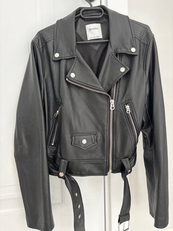 Siyah, fitted deri biker ceket, notched lapel yakalı, askılı kollu ve kemerli. Asimetrik fermuar ve gümüş detaylara sahiptir, günlük kullanım için uygundur.