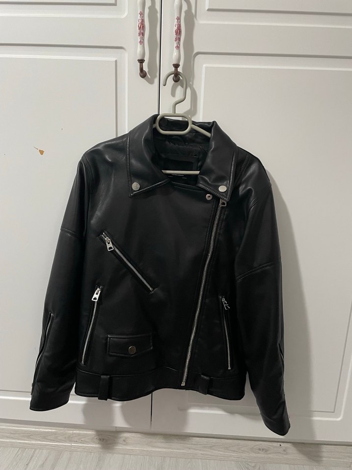Siyah deri, fitted biker ceket, çıtçıtlı yakası ve kayış detaylı. Fermuarlı cepler ve normal boy tasarım, rock punk tarzına uygun. Oversize 2 kere giyilmiştir