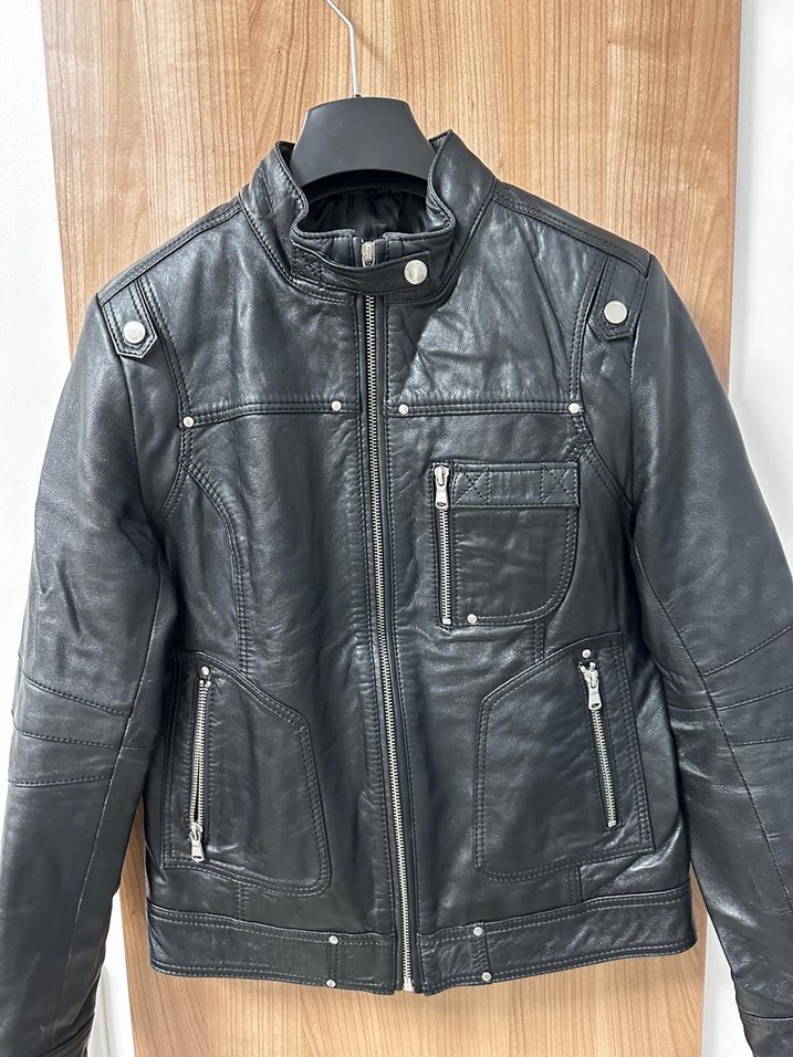 Siyah deri, tokalı ve çıtçıtlı detaylara sahip biker ceket. Strappy kollu ve normal kesim, sokak stili için uygun. Fotoğraf da gösterilen minimal alanda leke var. Ben çıkartmayı denemedim.