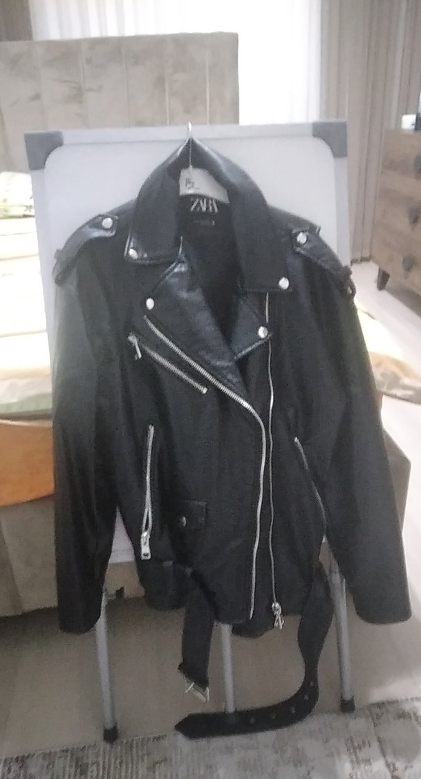 Siyah deri, fermuarlı, kesimli yakalı ve kayışlı kollu biker tarzı, günlük kullanıma uygun, rock punk havası veren dar kesim ceket.
