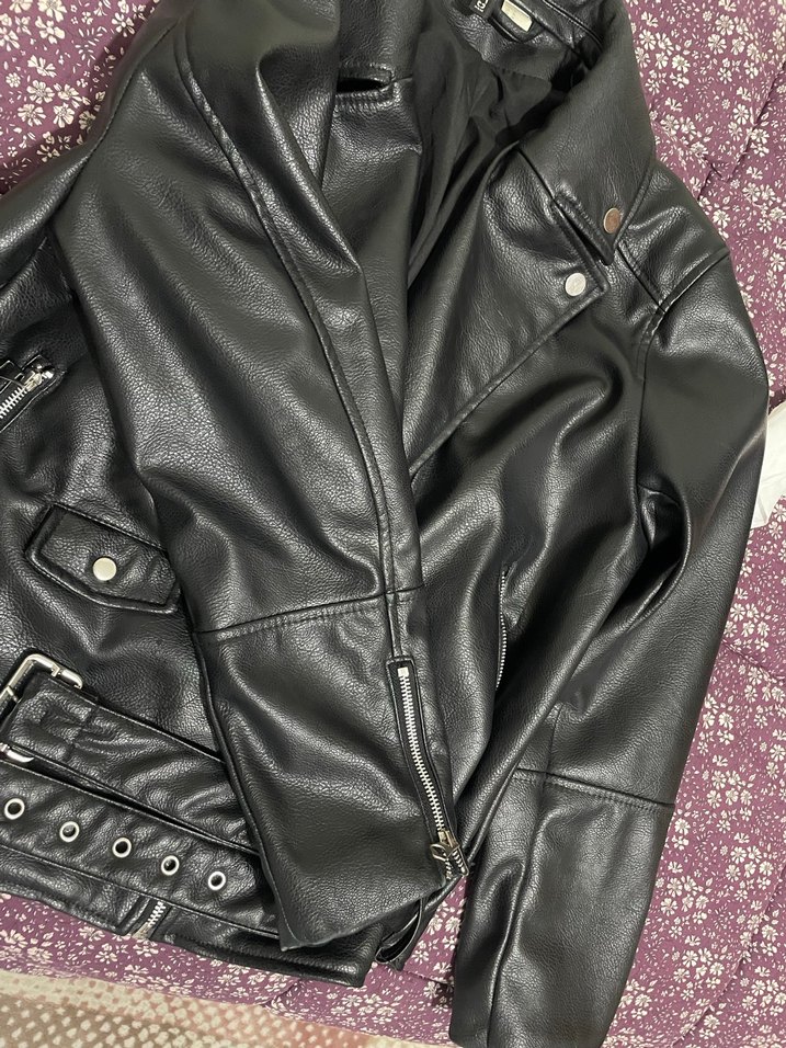 Siyah deri biker ceket, kesik yakalı ve fermuarlı detaylara sahip. Sıkı oturan kesimi ve askılı kollarıyla grunge punk tarzını yansıtıyor. Günlük kullanım için uygun.
