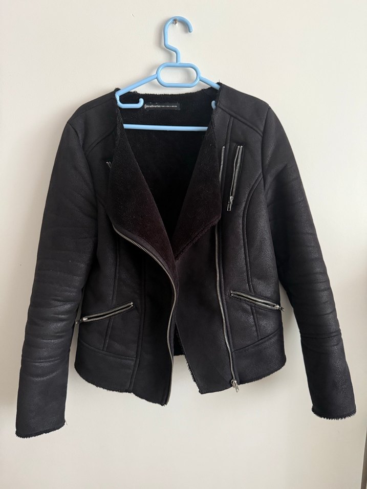 Siyah deri, fermuarlı cepli, notched lapel yakalı, midi boy, dar kesim biker ceket.