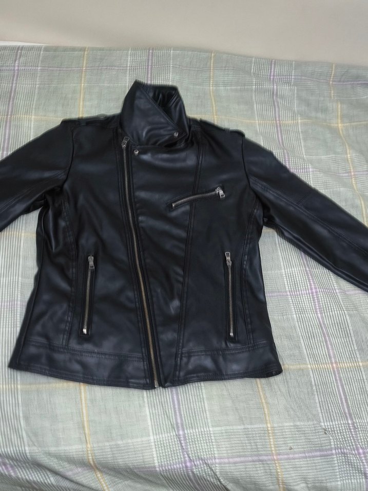 Siyah deri ceket, çıtçıtlı yaka ve fermuarlı detaylara sahiptir. Normal kesim ve askılı kolludur, M beden hiçbirşeyi yoktur birkaç kere giyildi
