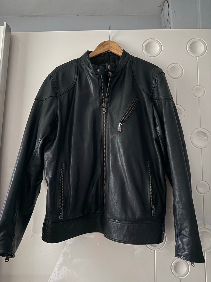 Siyah deri biker ceket, çıtçıtlı yakalı ve fermuarlı ceplidir. Uzun kollu, normal boy ve rahat kesimdir, gündelik kullanıma uygundur.