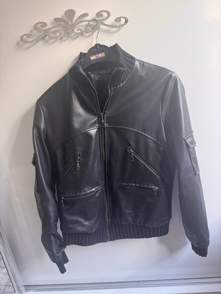 Siyah deri, yüksek yakalı ve fermuarlı cepli biker ceket. Uzun kollu, midi boyda ve rock punk tarzına uygun kesimde. 42 beden ama 40-38 olur