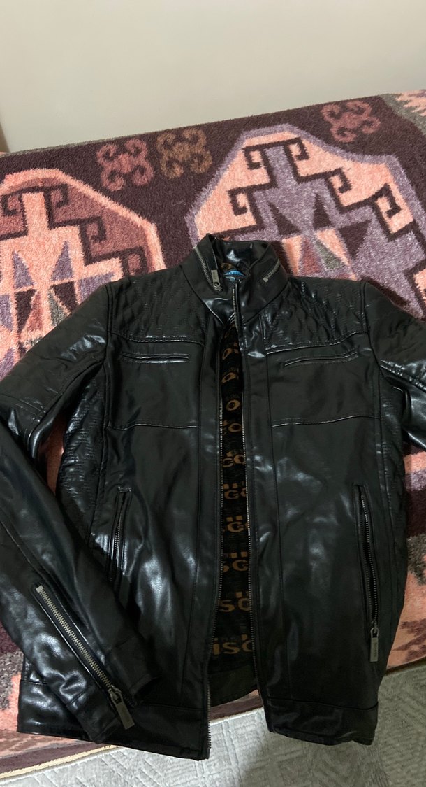 Siyah deri biker ceket, yılan desenli detaylar ve tokalı tasarıma sahiptir. Yakalı, uzun kollu ve normal kesimdir, günlük kullanım için uygundur.