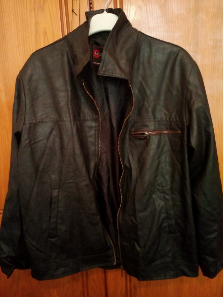 siyah deri biker ceket, çıtçıtlı yaka ve fermuarlı ceplere sahiptir. Uzun kollu, normal kesimdir, günlük kullanım için uygundur.