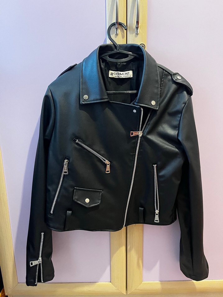 Fermuarlı cepleri ve kesik yakasıyla siyah, dar kesim deri biker ceket, kısa boy ve askılı kollara sahip, rock punk tarzında.