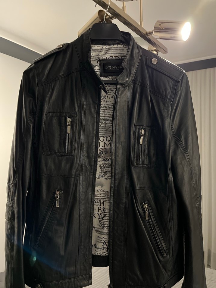 Siyah deri biker ceket, kemerli bel, çıtçıtlı yakalı ve fermuarlı ceplidir. Normal kesim, uzun kollu ve midi boydadır, günlük kullanıma uygundur.