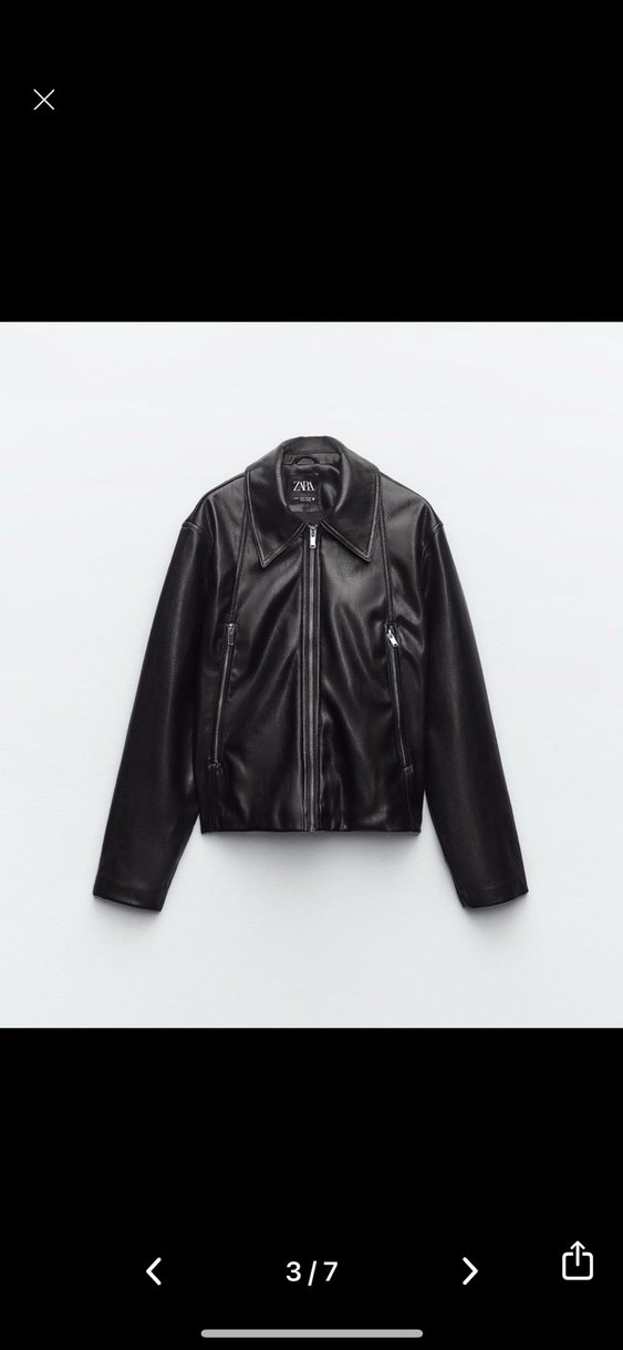 Siyah deri biker ceket, çıtçıtlı yaka ve fermuarlı ön tasarıma sahip. Regular kesim ve midi boydadır, minimalist ve şık bir görünüm sunar.