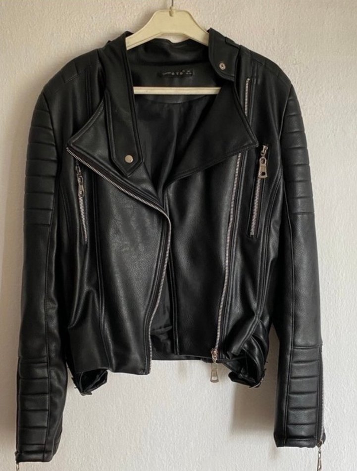Siyah, fermuarlı detaylara sahip, yakası kesik ve askılı kollu, midi uzunlukta, vücuda oturan deri biker ceket. Günlük kullanıma uygun.