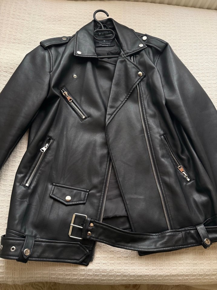 Siyah, oturmalı deri biker ceket, tokalı detaylar, kesik yakalı ve fermuarlı cepler içerir. Günlük kullanıma uygun trend bir model. Defosu vs yok 1-2 kez giydim dolapta duruyordu . Kol kısmında gözle görülmez bile az bir aşınma var belli bile değil