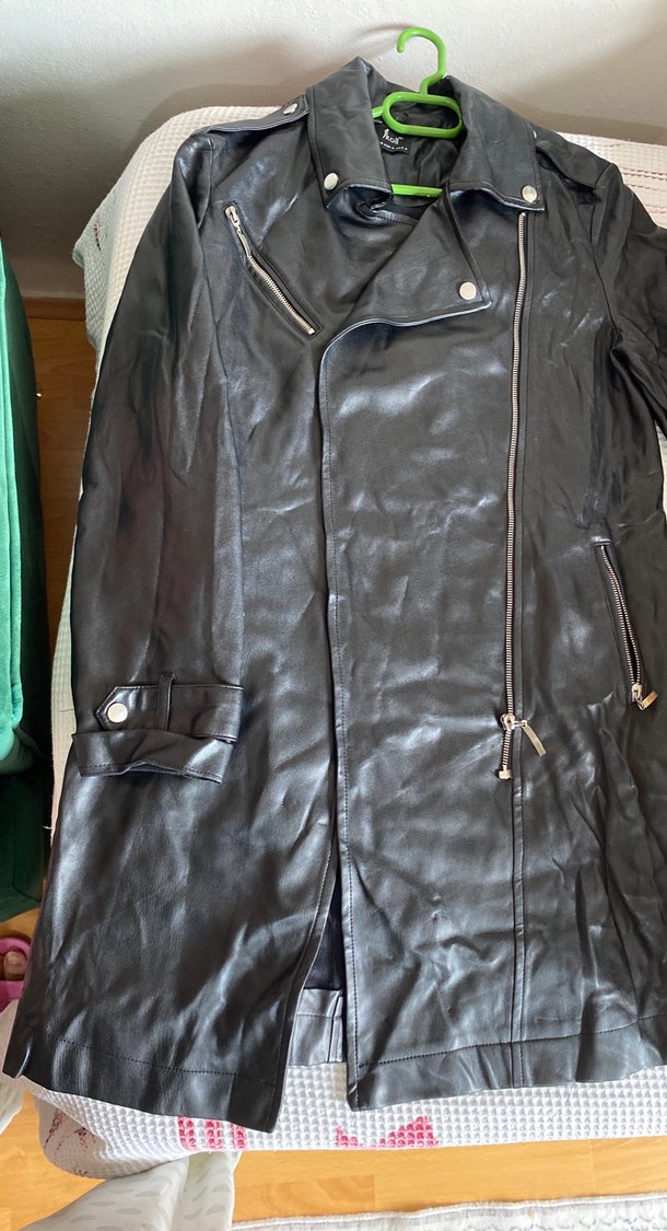 Siyah deri biker ceket, fitted kesim, kesik yaka ve fermuarlı detaylara sahiptir. Normal-midi uzunlukta, askılı kollu, sokak stiline uygun.