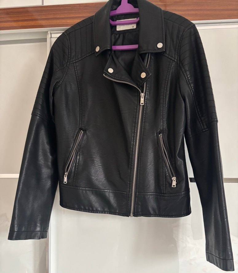 Siyah deri biker ceket, çıtçıtlı yakalı, fermuarlı cepli, normal boyda ve vücuda oturan kesime sahiptir. Günlük kullanıma uygun