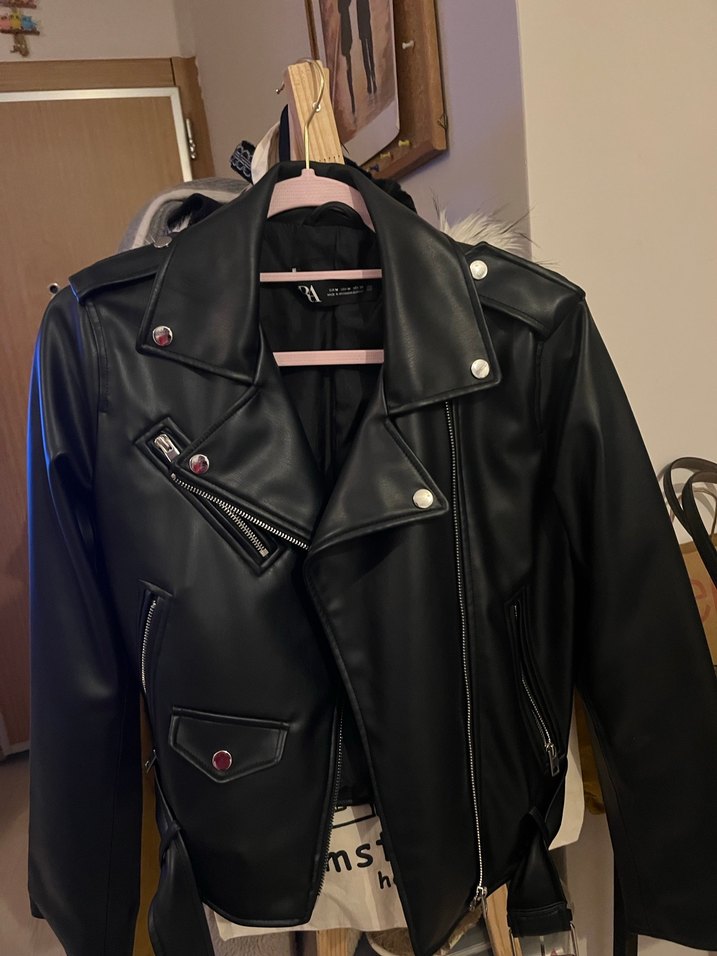 Siyah, deri, kayışlı, kesik yakalı, fitted biker ceket, rock punk havası sunar.