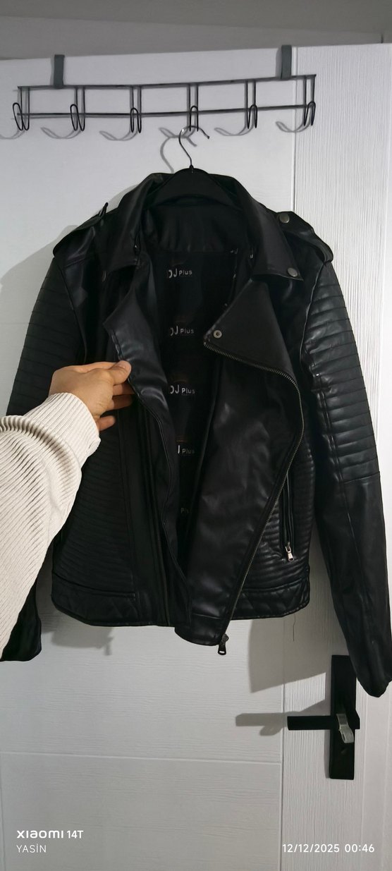 Siyah deri, fermuarlı ve kesik yaka detaylı, strappy kollu, normal boy midi kesim, dar kesim biker ceket. Günlük kullanıma uygundur.