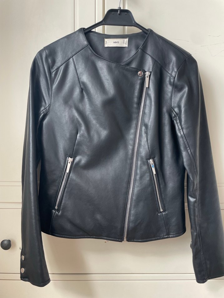Siyah deri biker ceket, fermuarlı detaylara ve kesimli yakaya sahiptir. Uzun kollu, günlük kullanıma uygun minimalist tasarımdadır. Sorunsuz neredeyse hiç kullanılmadı, S beden.