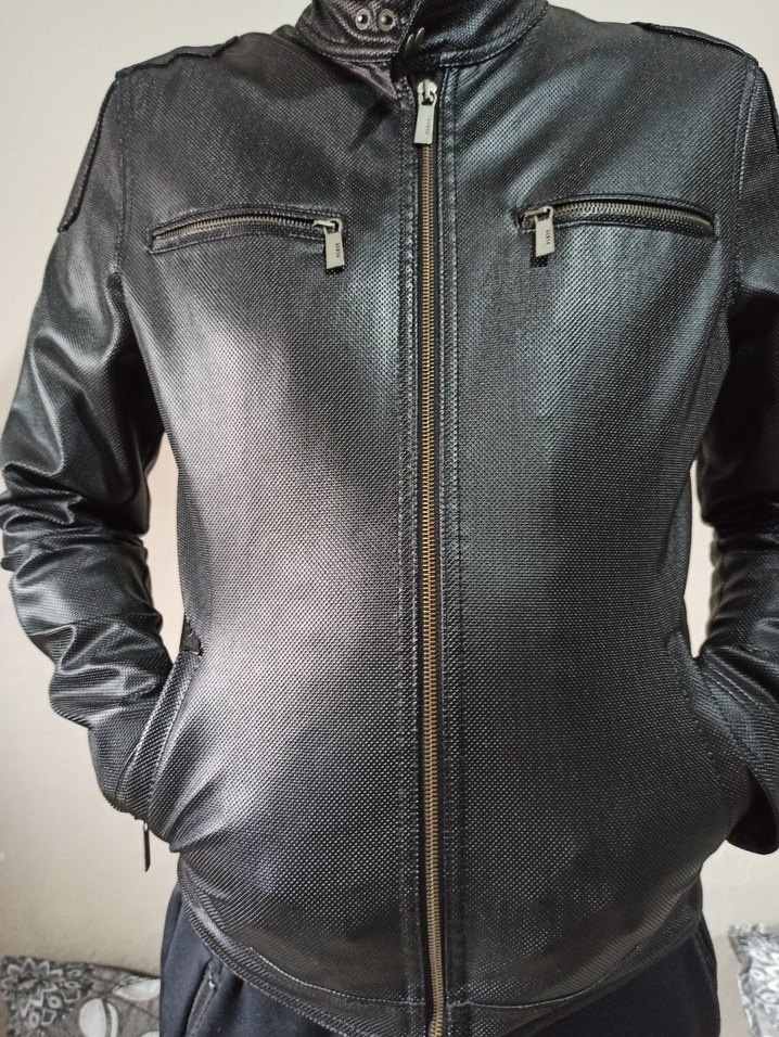 Siyah deri biker ceket, parlak görünümlü, kesik yaka ve fermuarlı ceplerle. Normal boy ve regular fit, uzun kollu, günlük kullanım için uygun. Kusur kısmı görseldeki gibi cep kısmındadır.İç astarı gayet sıcak tutuyor.