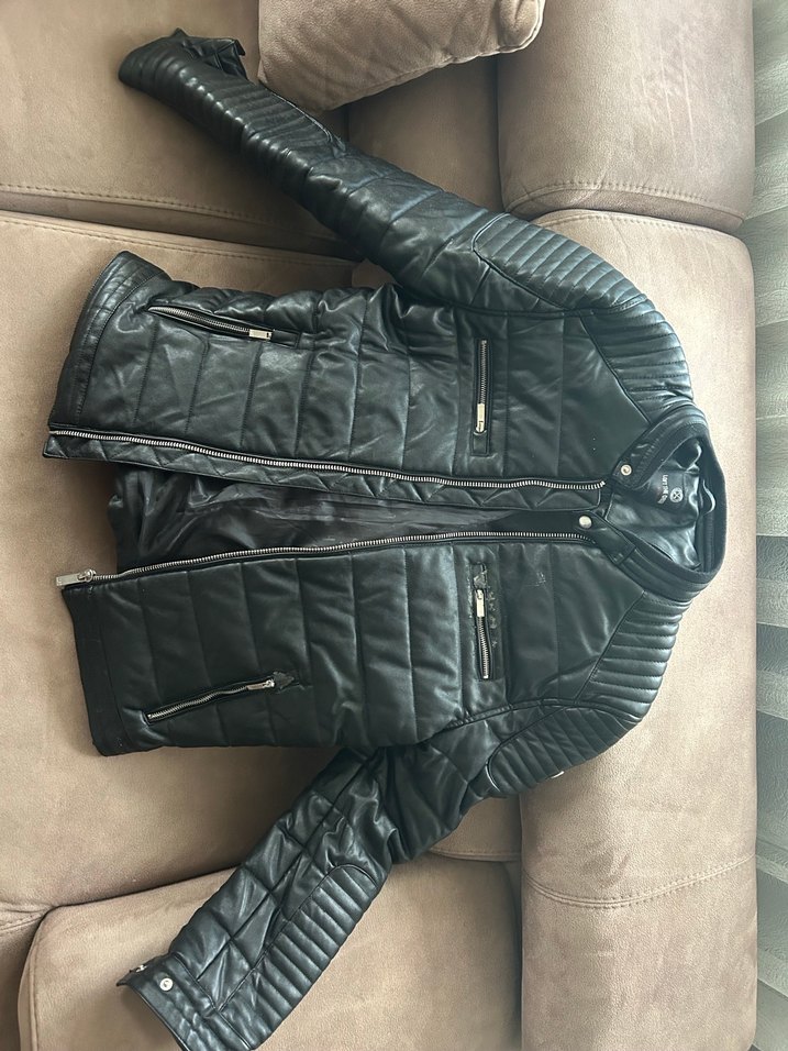 Fermuarlı detaylara sahip dar kesim siyah deri biker ceket. Normal boyda, askılı kollu, günlük sokak stili için uygun. dolapta dura dura eskidi hafif deformeler var uyguna veriyorum o yüzden
