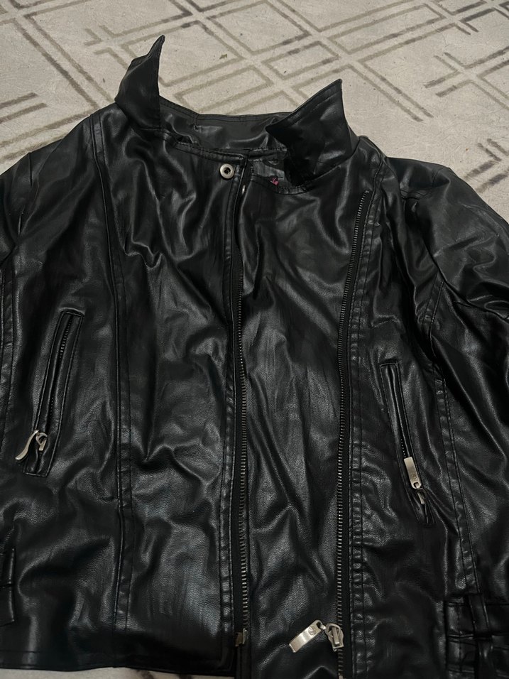 Siyah, fitted deri biker ceket, yüksek yakalı ve fermuarlı ceplidir. Uzun kollu, koyu renk ve desensiz tasarıma sahiptir, günlük kullanıma uygundur.