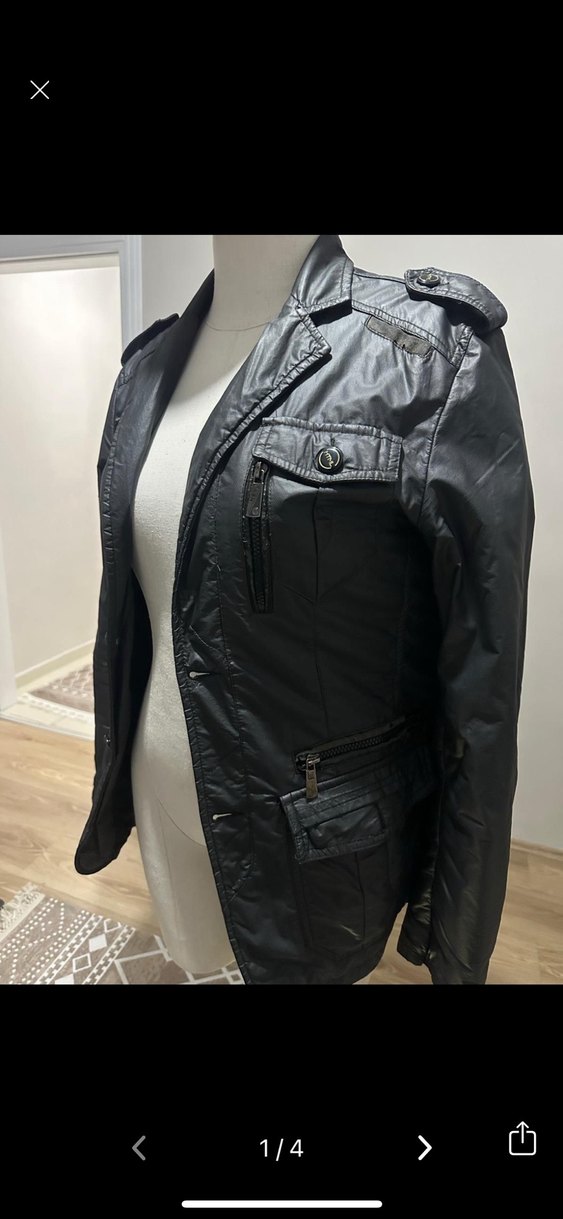 Siyah deri biker ceket, düğmeli detaylara ve kesik yakaya sahiptir. Normal kesim, askılı kollu ve midi boydadır, günlük kullanım için uygundur.
