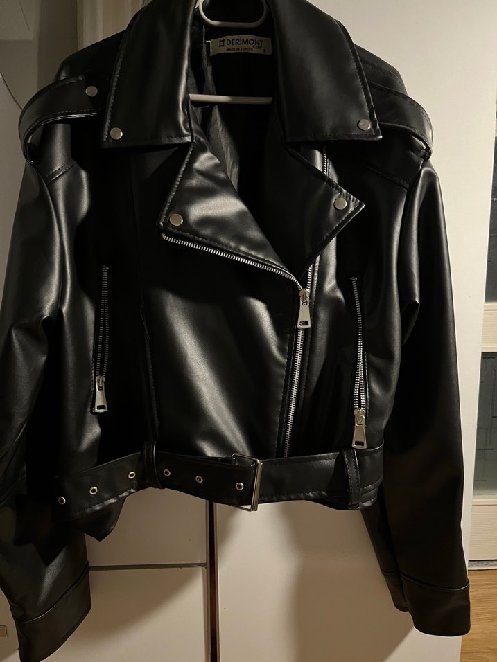 Siyah deri, notched lapel yakalı, askılı kollu ve tokalı detaylara sahip, fitted kesim biker ceket. Birkaç kez giyildi herhangi bir defosu yok.