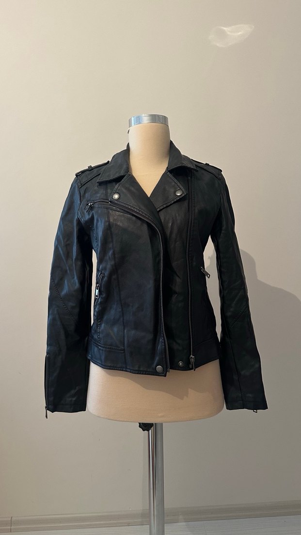 Siyah deri biker ceket, fitted kesim, yakasında çıtçıtlı notched lapel ve kemerli detaylar bulunur. Normal boyda ve askılı kolludur, günlük kullanıma uygundur.