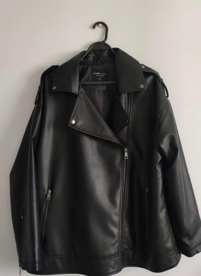 Siyah deri biker ceket, yakalı ve fermuarlı detaylara sahip, düzenli kesim ve askılı kollu, rock punk havası verir.