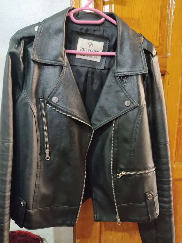Siyah deri biker ceket, keskin yaka ve fermuarlı detaylara sahip. Orta boy uzunlukta, askılı kollu ve grunge punk tarzında, şık ve rahat bir görünüm sunar.